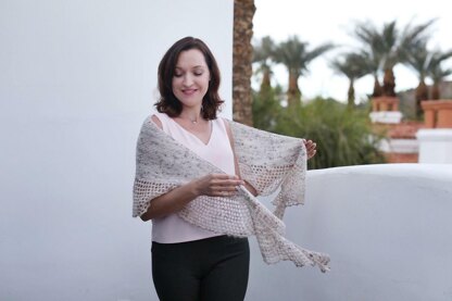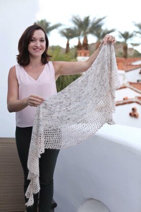 California Dreaming is a beginner-friendly, top-down crescent shawl with a garter stitch body and a mesh lace border. The body is knit with a speckled fingering weight yarn in a luxurious blend of merino, silk, and cashmere. The border combines the same yarn with a heavenly mohair yarn to create an ethereal, light-as-air border. The crescent shape encourages the ends to curl and flutter in the breeze.