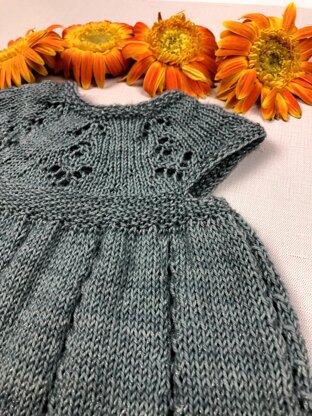 Calisee has a rich lace yoke and full ball gown princess skirt. As your baby grows, this will grow from a dress to a tunic and has a nice wide head opening at the neck. Top down design with a pretty lace pattern on the yoke and skirt. The yoke and the hem are charted and written out.
