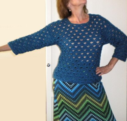 Callista crocheted crop top. A beautiful openwork sweater with a 3/4 length drop sleeve. It can be dressed up or down, worn over a shift dress, or with a skirt, or jeans. It crochets up very quickly. The fit is relaxed and it is worked flat. The pattern includes 4 sizes and a schematic. Sizes: S, M, L, XL. Yarn Weight: Medium Worsted. Skill Level: Easy. Crochet Hook: H