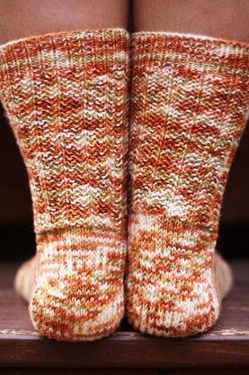 The Calvin sock is knit from the toe-up, following Cat Bordhi's Riverbed architecture. It features a fun, wild slip stitch pattern on the front of the sock, bordered by a garter rib on either side along the foot. Calvin makes the best of hand painted yarn and is sure to mix up the colors nicely. The heel flap transitions into the stretchy mistake stitch rib, balancing out the more rigid nature of the slip stitch pattern.