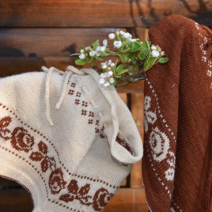 Calypso is a small, light cowl to wear at spring, on fresh days. It is knitted bottom up in the round, adorned with a band of Scandinavian-inspired roses and broadens slightly at the bottom. A few short rows make this cowl gently dive forward to cover the chest without to much cloth on the neck. Finally a drawstring allows you to snug it up.