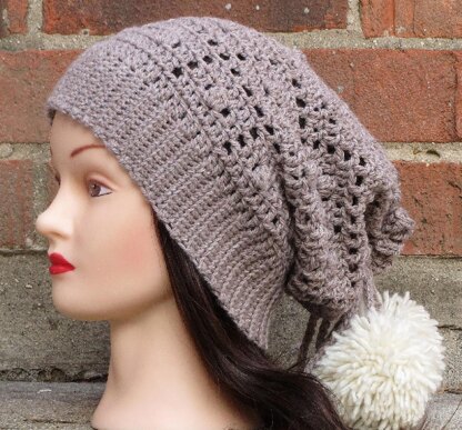 Camden is a gorgeous, extra slouchy beanie pattern that converts to a cozy and luxurious cowl! This hat features a lovely bobble grid stitch pattern, and closes at the top with a crochet i-cord drawstring adorned with huge, fluffy pom poms. This trendy, versatile hat/cowl is sure to become your go-to winter accessory! This pattern contains helpful, clear photos and easy to follow, detailed instructions; perfect for an advanced beginner!