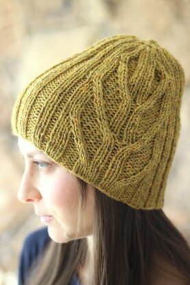 Cameo hat is a ribbed hat that features the same easy to work graphic cable as the StanLee cardigan. It's slightly slouchy for a modern fit and works up quickly in Aran weight.