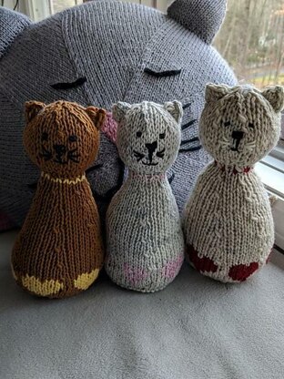 Camille, is a fancy cat with hearts. Finished toy size: Approximately 8.5” / 22 cm tall Yarn: Worsted weight yarn in two colors MC and CC. Suggested yarns: Cascade 220 Superwash, Dream in Color Classy, Sugar and Cream or any other yarn you have in your stash. About 100 - 150 yards / 91 - 137 meters total of MC About 30 yards/ 27.5 meters of CC. About 5 yards / 4.5 meters black yarn for embroidery. Notions: Yarn needle, scissors, stitch marker, polyester fiberfill (1 small bag) Skills: Knitting in the round, I-cord, increases, decreases, stranded colorwork.