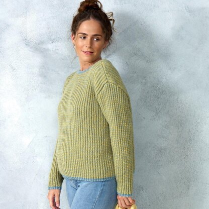 Camille is a long sleeved, round neck sweater knitted in a striped fisherman’s rib pattern.