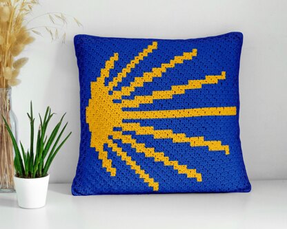 Camino de Santiago pillow - crafted using the mini Corner-to-Corner (C2C) crochet technique, this meaningful pixel design features the iconic scallop shell symbol—perfect for decorative cushions, travel-inspired bolsters, or as a heartfelt accent in a cozy throw or blanket.
