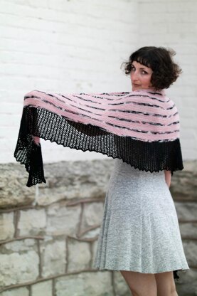 The inspiration for this shawl started with the yarn. The boldly variegated pink and black of the Cabaret colorway in Manos Del Uruguay’s Alegria required something special. After poring over pictures of Can Can dancers with their ruffled skirts and fishnet stockings, I developed this shawl pattern. The semi-solid main color provides the perfect counter-balance to the variegated contrast color, and the deep black border finishes the shawl with style.