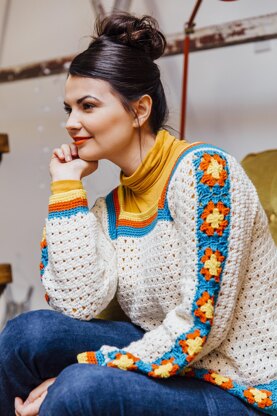 Inspired by 70s colours and fashion this top is sure to make you smile. The combination of Granny squares and granny stripes make it an interesting make. Yoke neckline and vibrant colours add to the charm. Expand your skill level to the next step with this pattern.