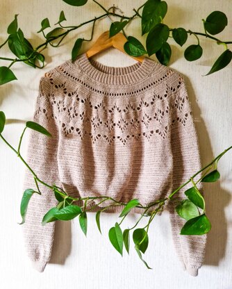 Adult Crochet Pullover Cande is the sister pullover to the Candelaria Cardigan. They were both inspired by my Abuelita Cande, whose favorite thing is to sit in a comfy corner of the house with a good book and a warm cup of tea. It is a seamless top-down round-yoke pullover, which allows for customization and comfort. Its lightweight fabric is perfect for keeping warm and layering up during colder months. #CandePullover