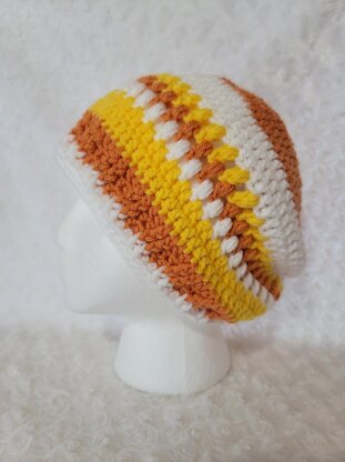 Looking for a fun, quick, and warm hat pattern to crochet up for this Halloween holiday season? The Candy Corn Slouchy pattern is just the thing!