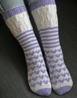 These knee-high socks knit from the cuff down offer almost as much selection as a candy store to a kid! Treat yourself to knitting cables, stripes and cute stranded hearts – the resulting socks don’t even have calories! If you’re not quite ready for the shaping involved in knee-high socks or stranded knitting, try Candy Socks - Little Sister. Many thanks to my tech editor Michelle Hazell and my testknitter san-drarobben. Any remaining mistakes are mine.