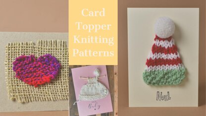 There are 3 knitting patterns - a mini baby dress for baby shower/birth cards, a festive Santa hat, and a sweet love heart appliqué for hand made cards for weddings, valentines day etc.
