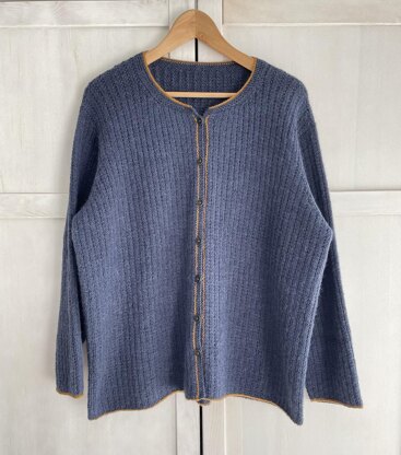 The cardigan has a continuous rib pattern and contrasting coloured edges.