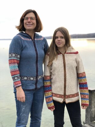 **Cardigan - “Dagi”**This cardigan was designed by me a long time ago. My intention with this colorwork design was to create an easy pattern for knitters who want to get started on Fair-Isle technique without the next big jump into steeking. My greatest challenge while writing the pattern was the different gauges with the colorwork and plain stitches. So, I have not stopped writing down this pattern until it worked out finally just perfectly. The trick was to use a top-down construction. I have knitted this cardigan several times myself. As you might guess, we really love this garment and I hope you will love it as well!
