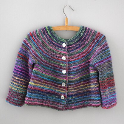 Diese Jacke wird unkompliziert von oben nach unten und kraus rechts gestrickt. Durch einige Zunahme-Reihen entsteht die Form der Rundpasse. Nach Fertigstellung der Passe werden Körper und Ärmel getrennt in Reihen und Runden beendet. Die Jacke hat eine leicht schwingende, moderne Form. Das farbenfrohe Noro Garn „Silk Garden Sock“ wirkt am schönsten, wenn man mit zwei Knäuel arbeitet und jede zweite Reihe wechselt. Dadurch entstehen noch mehr interessante Farbwechsel. Die Jacke wird vorn mit Knöpfen und den eingearbeiteten Knopflöchern geschlossen.