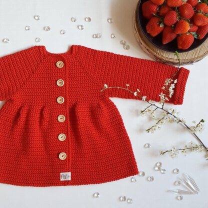 MATERIALS: 1. Yarn of group 3 DK & light worsted: 115yds(105m) /1.75oz(50g) 14oz/400 g (length of cardigan 38 cm like the red one on photo)- 16oz/450 g skeins (length of cardigan 42-43 cm). For example, DROPS Merino Extra Fine, DROPS Cotton Merino, LION BRAND YARNS Coboo, Baby Hugs Light Red Heart
