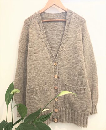 GARMENT CONSTRUCTION: This wonderful boyfriend style cardigan is worked seamless from the top down with Raglan increases. Neckline increases are added later for a nice V-Neck front. Body is worked flat to underarm, then sleeves are separated, and body is finished. The sleeves are later worked in the round. Button band and pockets are added last.