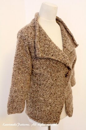 Caribou wrap is full of sumptuous texture and cosy comfort.. Open front allowing versatile closure. Features alternating bands or stockinette and reverse stockinette stitch for a textured look, 3/4 sleeve length. Simply charming!