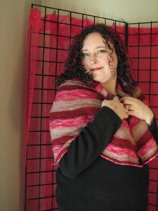 The Caritas is a rounded striped shawl pattern with a cozy privacy. It can wrap close to your neck for warmth or drape gently around your shoulders. The pattern features stockinette and garter borders allow you to completely cover up, without being a traditional lacy shawl. And large stripes of color allow you to pick several of your favorite sock yarn colorways to blend together.