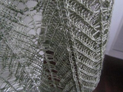 Twisted stitches emphasize this chevron design with fluted edges. It is beautiful whether it is blocked or not. Blocking emphasizes the twisted stitches. A perfect accessory for all seasons.