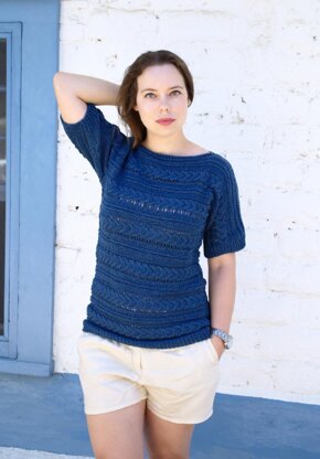 This very vacation-on-the-beach-looking top is knitted in one piece from sleeve cuff to sleeve cuff in a Cable/Lace pattern. Side seams are joined with 3-Needle bind off and sleeve seams are sewn. Stitches for ribbed hem are picked up along the bottom edge of the top and worked in round.