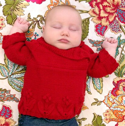 An adorable raglan sweater with a blooming bed of fresh spring flowers and a cozy asymmetrical shawl collar.