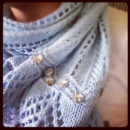 It struck me that there should be some sort of more flexible option—a scarf that could become a cowl, depending on one’s fancy. Also, Caroline Bingley is a hard woman with sharp edges, so I wanted to create something with peaks and points and a cold, sharp sparkle. She lacks the gentle ease and quick wit of Miss Elizabeth Bennet, and she prefers the stiff formality of her own high society. The columns, extended lace in the trim, and the sparkling buttons emphasize this.