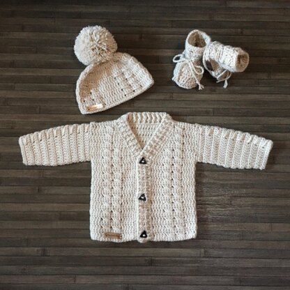 CARTER CARDIGAN SET CROCHET PDF - A timeless baby cardigan, hat and booties set with cable stitch panels. Cardigan in 4 sizes Newborn to 2 years. Hat 9 sizes Prem - 10 Years and Booties to 1 Year. Cardigan made seamless bottom up. Hat in the round top down and booties bottom up. Unisex - Baby Boy or Baby Girl.