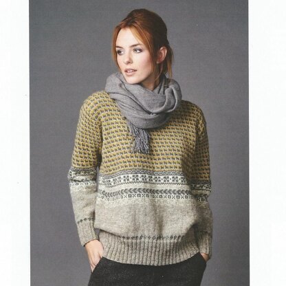 Inspired by classic tweed and fair-isle fabrics, the pattern has a slip-stitch pattern on the upper sections and simple fair-isle below. The shoulders use the English tailored method, which sets the seams slightly back on the shoulders to give smooth shoulders and a pleasing fall at the back.