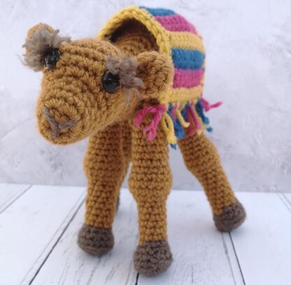 MATERIALS NEEDED - 3.5mm (E/4), 4mm (G/6) and 6.5mm (K/10.5) crochet hooks, Aran (Worsted) yarn in two colours for camel and 3 colours for blanket, 2 x 12mm (0.5") black toy safety eyes, polyester toy stuffing, yarn needle. Stitch markers.
