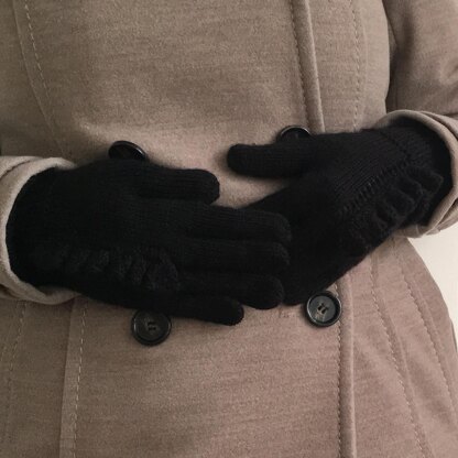These gloves have a lace stripe and a small ruffle running up the back of the hand and are knitted in the round on double pointed needles.