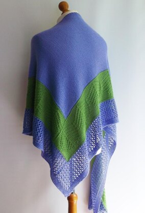 We start by knitting a triangle, then a leaf motif is work around two of the edges. Finishing off with a simple lace border. This sideways knit triangular shawl requires you to pick up stitches, knit/purl into the back of stitches and work a simple lace pattern.