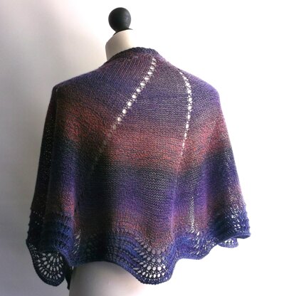 This half circle shawl uses one skein of yarn and is worked in five sweeping sections using yarn over increases. A simple feather and fan border completes the garment.
