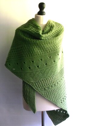 This large triangle shlanket, shawl/blanket, is worked bottom up using thirteen different stitch patterns. Lots of interest for an intermediate plus knitter.