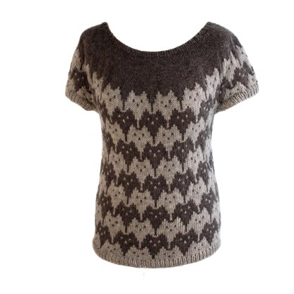 This sweater is knit in the round from the top down. The yoke is worked first, once all of the increases have been made and the first chart has been worked the sleeves are separated and the body can be worked to any length. The pattern includes instructions for 14 sizes and a comprehensive schematic. The stranded colourwork sections are charted only.
