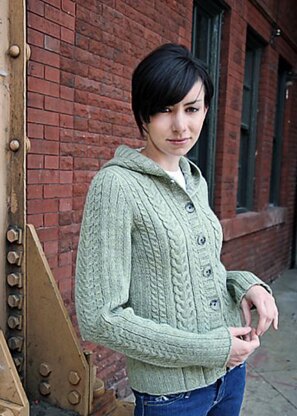 Chic Knits Cassidy features low-bulk easy cables, non-binding ribbing, flattering set-in sleeves and a patterned hood for casual elegance and charm.