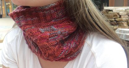 This cowl (as well as the hat and fingerless mitts) was based on my design for Castle Walls Socks. The socks were designed to look like a castle. The cowl has a castle door and a brick pattern for the cowl body, and garter rib at the bottom and top edges.
