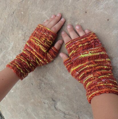 These fingerless mitts (as well as the hat and cowl) was based on my design for Castle Walls Socks. The socks were designed to look like a castle. The mitts have a brick pattern and garter rib at the bottom and top edges.