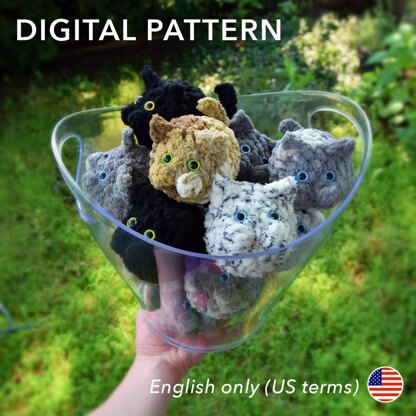 These cat balls work up super fast, use less than 20 yds (about 0.70oz) of chenille yarn, and they're so stinkin' cute! The cheeks, ears, and tail are all worked as part of the body, no sewing required! Great for markets, last-minute gifts, and more. They were designed for super bulky chenille yarn but they're SO tiny and cute in worsted weight yarn, or even TINIER in crochet cotton thread!