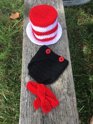 This is an easy pattern for an adorable Cat in the Hat inspired outfit. Pattern is sized for a newborn but can be easily adjusted by using thicker yarn, a bigger, hook, or adding extra rows/stitches. Hat circumference (inside not at brim) is about fourteen inches. The bow tie is made to be completely adjustable because triple row can act as button holes all the way across. The diaper cover fits size newborn to three months. Hat is worked in the round. Bow tie and diaper cover are worked across.