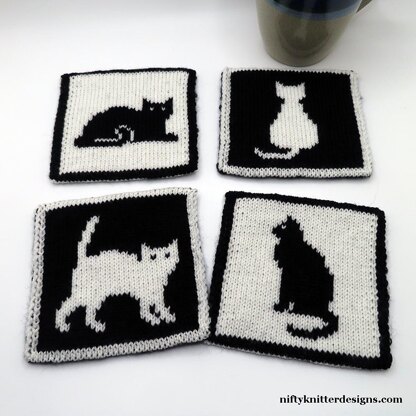 Decorate your kitchen with this cute set of four cat coasters! Perfect for a knitter or anyone else who loves cats. They make great quick gifts!