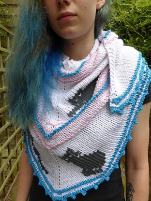 The shawl is knit mainly in stocking stitch from the top down, with the increases made at the beginning, centre and end of the knit rows. The garment features a simple decorative cast off edging along the two sides and garter stitch across the top. The cats are added using a thicker, chunky/bulky weight yarn and duplicate stitch (Swiss darning) upon completion of the shawl; this means you can add as many cats as you like, placing them where you wish, or leave the shawl cat free!