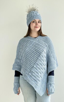 An easy knit for the confident beginner as all patterns are created just using the knit and purl stitch, and yet interesting enough for the experienced knitter. Skills needed are cast/bind on and off, knit and purl, knit or purl 2 together, and sewing up. Instructions are in English with British/USA terms, and photos help you sew the poncho up. Any chunky/bulky yarn should be fine, but please check your tension/gauge.