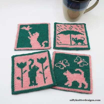 Decorate your table for the spring season with this cute set of four cat coasters! Perfect for a knitter or anyone else who loves cats. They make great quick gifts!