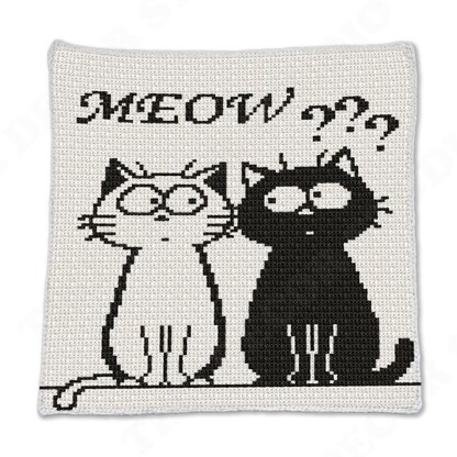 Pattern is a charming crochet design featuring two curious cats with expressive faces and a playful “MEOW??” detail. A clean graphic style and soft contrast create a cozy stroller and crib blanket look, well-suited for calm nursery spaces.