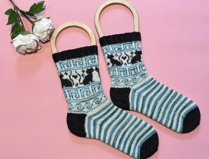 Needles: 2-2.5 mm/ 0-1.5 us, or size needed to obtain gauge. The sample shown was knitted using smaller needles in ribbing, striped stockinette stitch and toes.Yarn: Any fingering weight (approx. 400m/100g) sock yarn. The sample shown was knitted in: Filcolana Arwetta colors Dark Chocolate (975) and Natural White (101), Hip Hei sock yarn color Maledives.