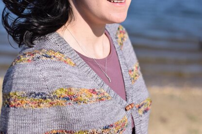 Cattail is a softly flowing A-line cardigan with textured stripes. Knit in one piece from the top down, the cardigan begins with the back neck. Shoulders and sleeve caps are shaped using Susie M’s contiguous method of construction. The eye-catching stripes are created by using an off-set stitch pattern and a beautiful hand-dyed yarn by Amanda Hope Yarn.