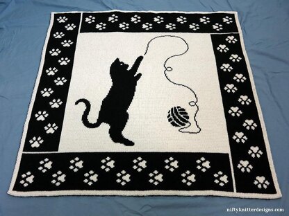 As a cat owner and knitter, I know it goes without saying that keeping cats away from yarn is a project in itself. With this blanket, I wanted to show the playfulness of a cat going after a ball of yarn, with the ball unwinding as the cat plays. It’s perfect to snuggle under with your kitties!