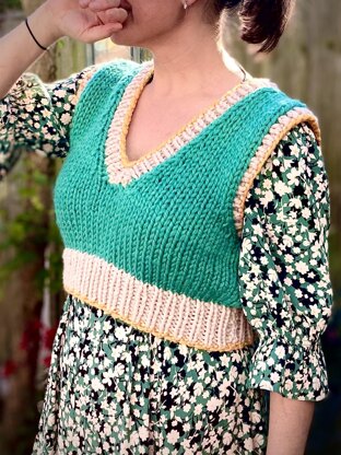 A cute chunky knit tank top that is a perfect trasitional piece to pair with your favourite dress or long shirt. It is a cropped style that knitsup super quick on 12mm needles and is a great way to extend your summer wardrobe well into Autumn.