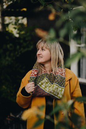 Nothing can beat a warm, colorful fair-isle cowl on chilly evenings. “Cecily’s Cowl” is worked in the round, like a tube that’s seamed at the end in the form of a moebius. You can make it long and shorter (if you work blue chart box just once) or continue until you’re satisfied, or run out of yarn.